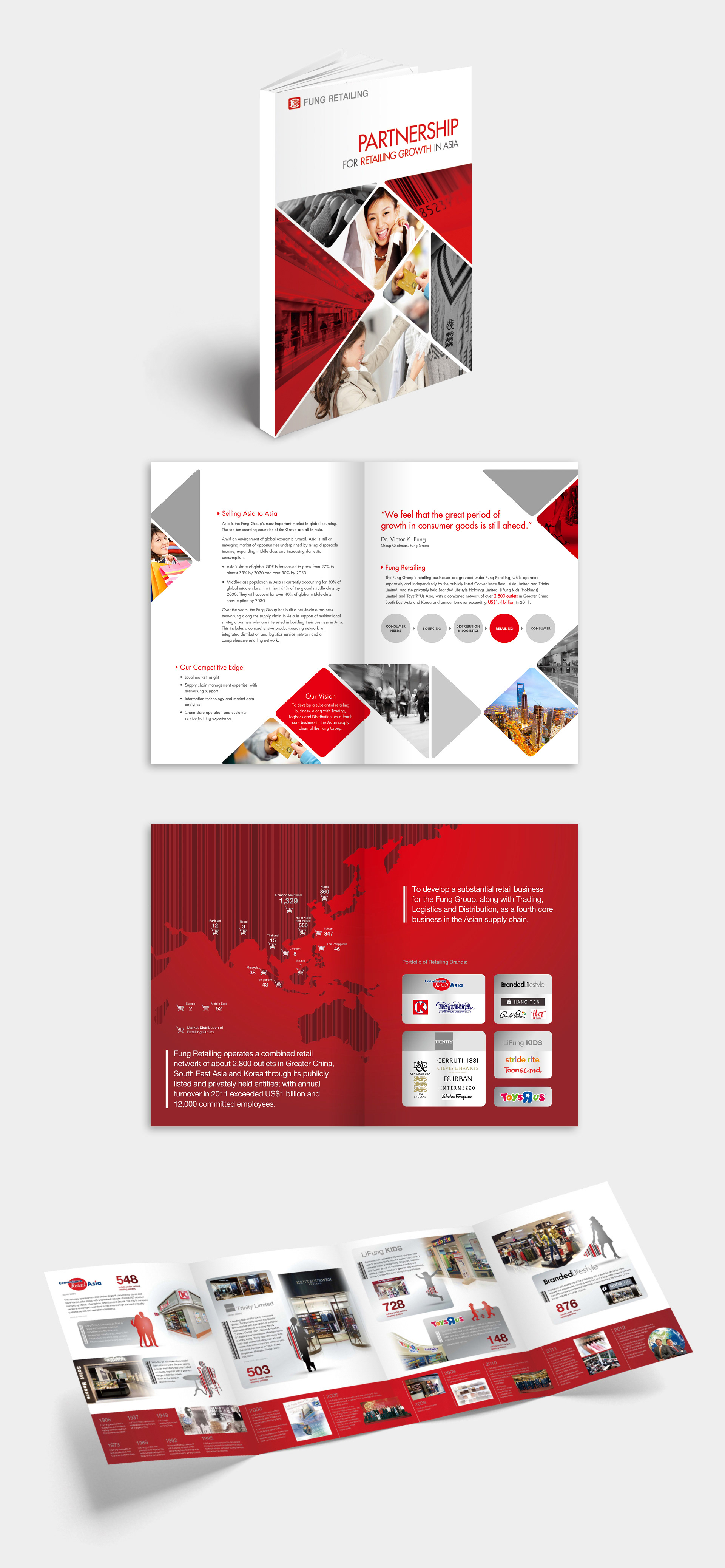 Design a promotional brochure for the retail industry, including various infographic displays. Use the main colors of the group logo to create a cohesive design.